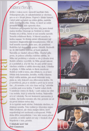 Vážení čtenáři, Držíte v rukou nové, vpravdě kacířské číslo. Dokazujeme jím, že uskutečnitelné je všechno, pro co si v životě jdeme. Poprvé v lidské historii, i když ještě ne úplně na celém glóbu, nadešla doba mladého člověka. Doba, ve které se může prosadit každý, kdo opravdu chce. Podnětem pro napsání byl den, kdy jsem dostal malou knížku. Jmenuje se Neštěstí ve štěstí. Poslala mi ji dívka, která se ani neměla narodit. Neměla zvládnout školu. A hlavně neměla tu knihu napsat. Ve třetím měsíci těhotenství její mamince diagnistikovali toxoplazmózu. Dítě se buď nemělo narodit, nebo ano, ale postižené. Rodičům byl doporučen potrat. Odmítli. Rozhodli se, že dítě budou milovat, ať bude jakékoli. Narodila se vlastně zdravá Míša. Vlastně píšu proto, že jednou učitelka rodičům sdělila, že Míša má problémy s učením a vše jí dlouho trvá. Rodiče učitelce vysvětlili, že Míša prostě taková je a požádali ji, ať jí dá čas, že pak určitě sama všechno zvládne a udělá obrovský skok. Učitelka to přijala. A Míša začala ve škole exelovat. Rodiče ji vedli k tomu, aby dělala to, co ji baví. Dělala tedy keramiku, kreslila, tvořila rukama. Když viděla tatínka, jak smolí lektorské texty, ptala se, když dokončí onu slibovanou knihu. On jí vysvětloval, jak je to složité a proč na to nemá čas. „Já nemám o nic více času než ty,“ odvětila a začala psát svou knihu. V každé volné chvíli. V autobuse cestou do školy, v autě cestou na výlet i na mobilu, když jí nebavila hodina. Nakreslila si k ní obrázky. Na své šestnácté narozeniny ji vydala. Její knihu nemám sílu číst, protože mi už na první stránce tečou slzy. Je to typická malá slečna. Dokázala všechno, co dokázat neměla. Toto vydání je věnování nejen Míše Gřeškové, ale všem malým lidem, kteří nepodceňují své možnosti a schopnosti. Přišla doba dříve nemyslitelná. I ten, kdo nemá původ a peníze, si může splnit své sny v čemkoli chce. Nepolevte v tom, prosím. V hluboké úctě VášPetr Casanova